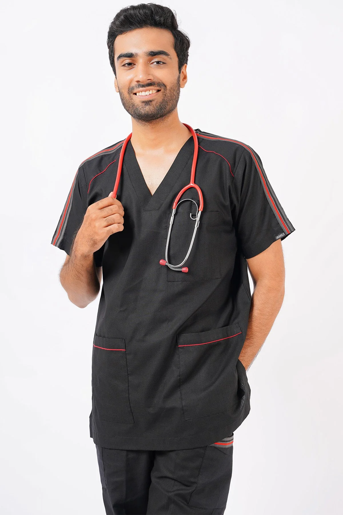 - Red tap and piping on shoulder and sleeves